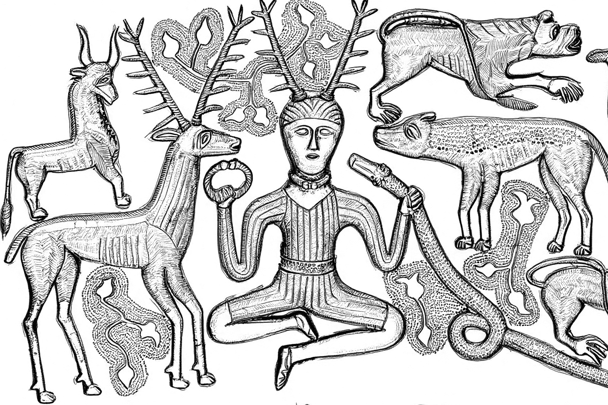 Above we see Gundestrup cauldron, plate A, 1 BCE. The main figure is identified as Cernunnos, a Celtic deity associated with wild nature, fertility, animals, and liminality. His antlers, modeled on a stag’s (to his left), assumes to symbolize a deep connection to the animal world, growth, and seasonal renewal. They also suggest a shapeshifting or boundary-crossing nature, he is neither fully human nor animal, embodying both. Animal and human, nature and culture are merged into one.
